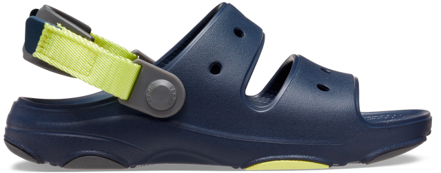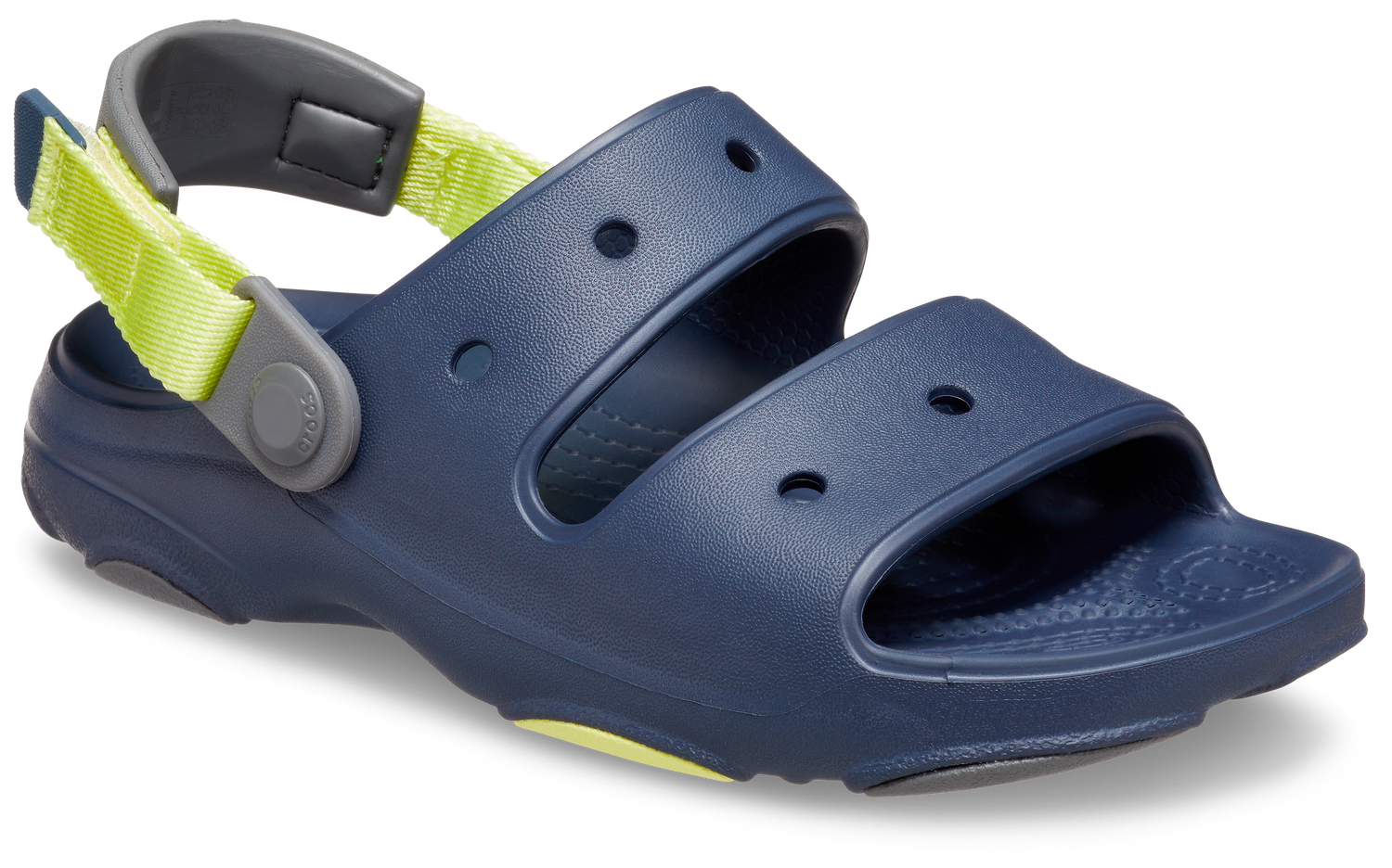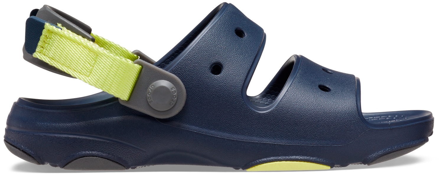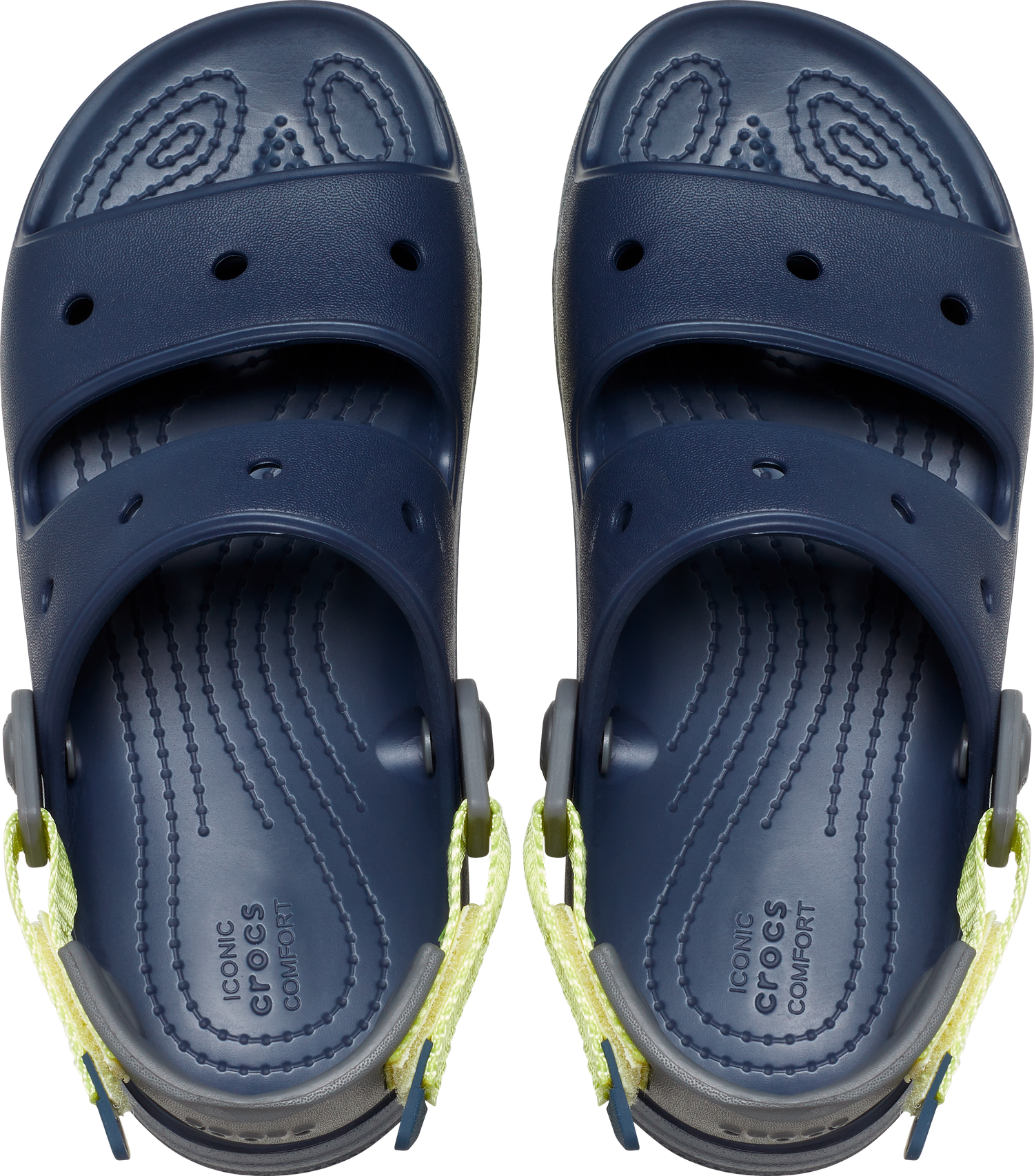Travel. Exploration. Adventures near and far. The look and feel of our Classic Kids All-Terrain Clog, now in sandal form. The rugged tread pattern and rubber pods add traction and support, while the two-strap upper and adjustable turbo backstraps work to keep up with their outdoorsy lifestyle. Seven holes in each sandal allow for personalization with Jibbitz™ charms and a lightweight Croslite™ foam construction makes them a practical choice for any outing. Flip that strap back and go wild.