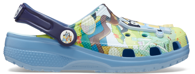 "Cheese and Croc-ers! The Bluey x Crocs collection has arrived, with these Bluey Classic Clogs for kids. An all-over print provides a backyard playground for oversized Bluey and Bingo Jibbitz™ charms, as they try to keep the red balloon in the air. And little ones can join the fun! SPECIFICATIONS Incredibly light and fun to wear Custom-printed upper featuring Bluey’s outdoor world Oversized Jibbitz™ charms of Bluey, Bingo and a red balloon Jibbitz™ charms are not removable on kids and toddler Crocs for safety “Bluey” logo on the back of heel strap Water-friendly and buoyant; weighs only ounces Designed to enhance breathability Easy to clean and quick to dry Pivoting heel straps for a more secure fit Customizable with additional Jibbitz™ charms Iconic Crocs Comfort™: Lightweight. Flexible. 360-degree comfort"