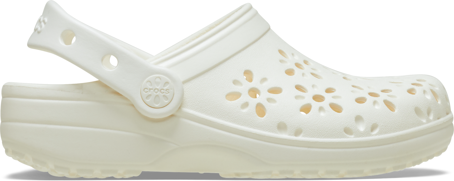 "The Classic Clog with a fresh, feminine twist! This new evolution of our clog features floral-inspired cutouts that provide a joyful, fun look, plus matching floral rivets that unify the design. These still feature the fully-molded lightweight construction and iconic comfort of the original, and can still be personalized with Jibbitz™ charms. It’s the irreverent, go-to comfort shoe that you and your kids love — now with a fun, floral update! "