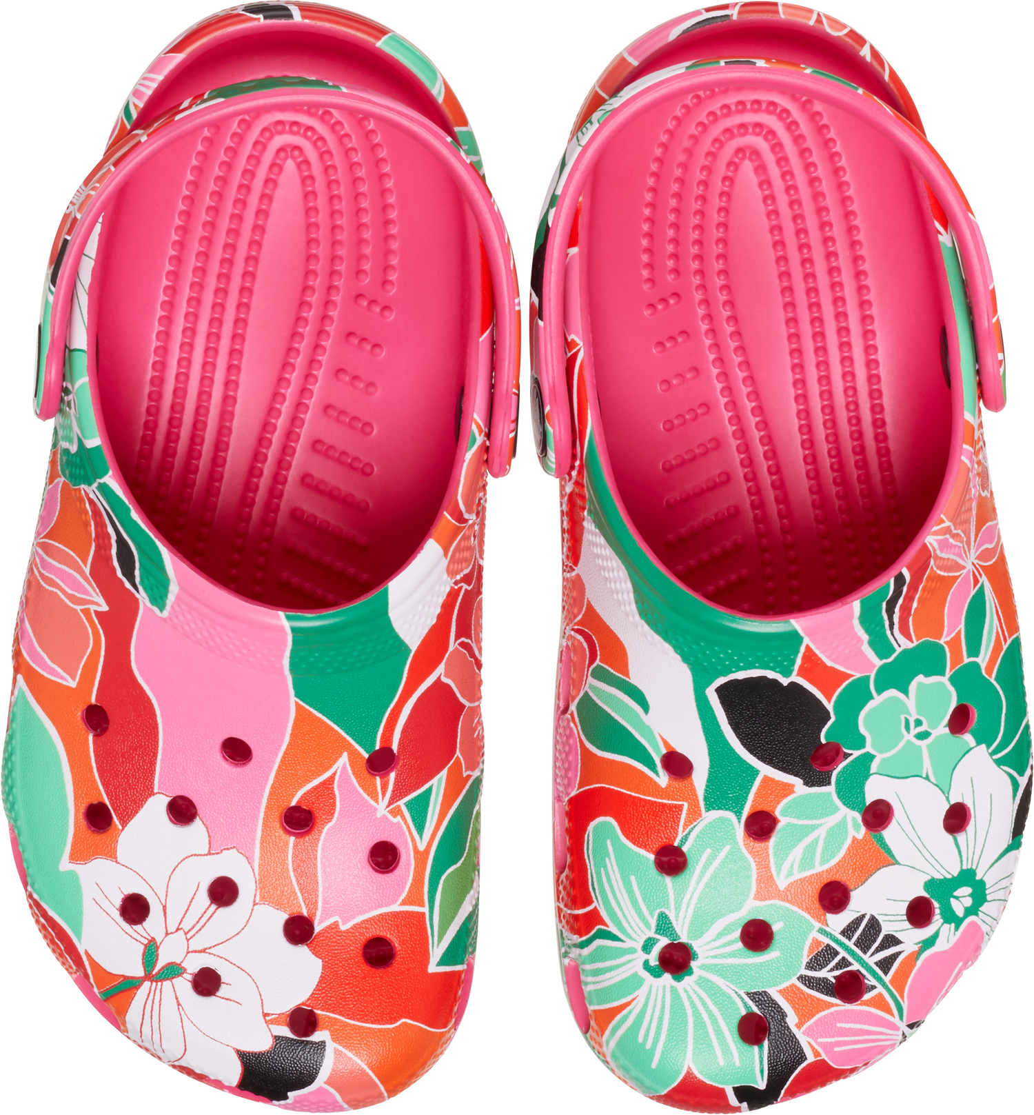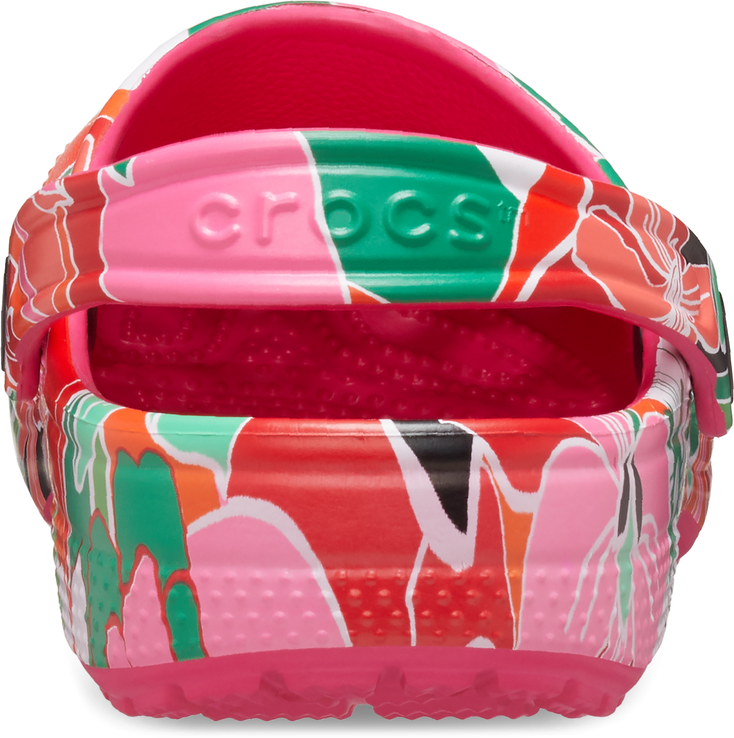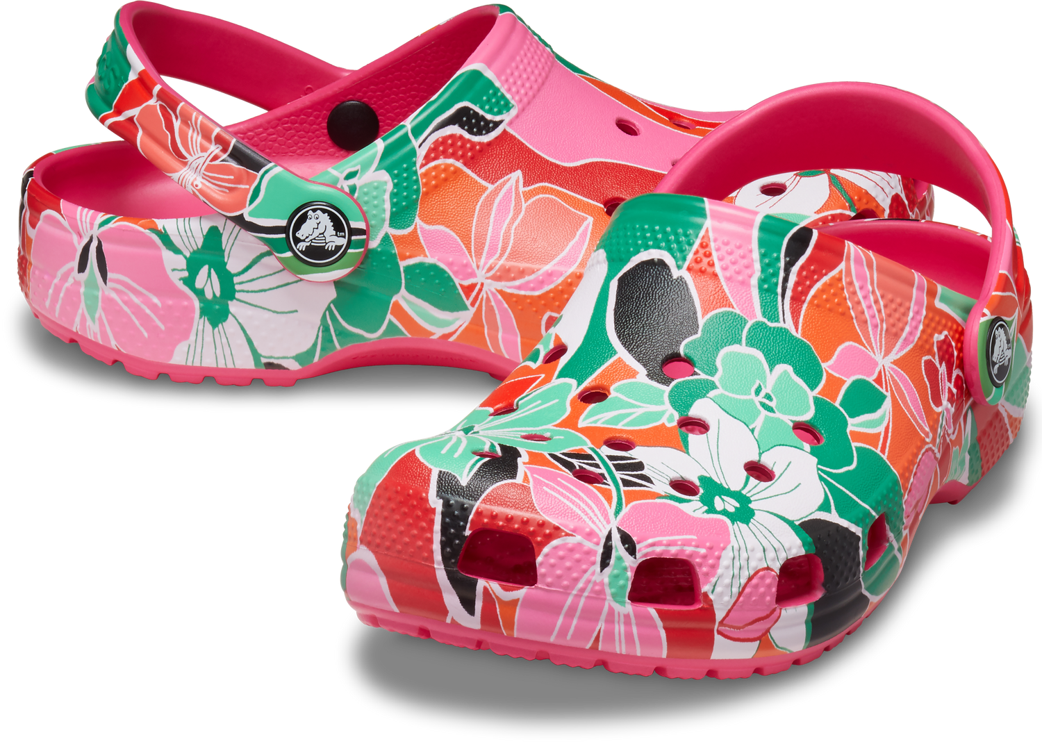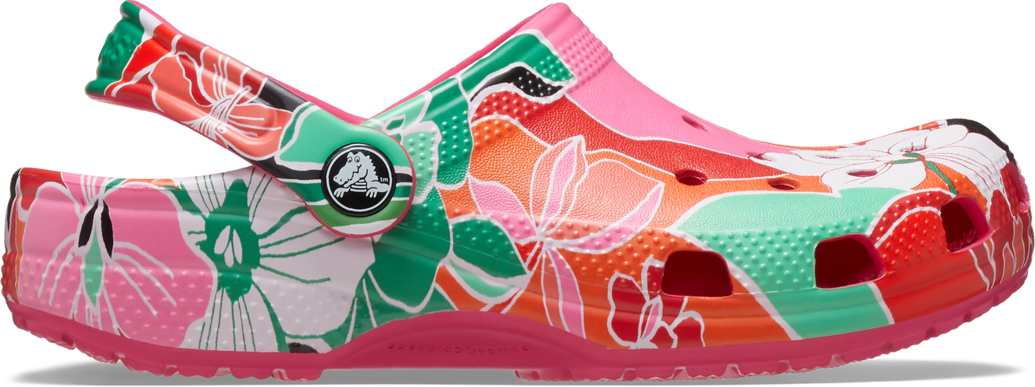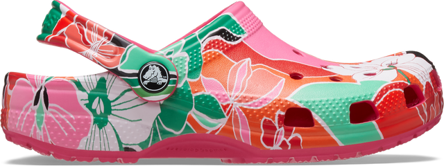 "A colorful graphic inspired by woodcut floral designs provide extra style to this version of the iconic clog. The stylish graphic helps you show off your creative spirit, and Croslite™ foam construction keeps them light and easy to wear. Grounded in comfort, spiked with personality. Kids’ Classic Woodcut Floral Clog Details: Woodcut floral graphics Incredibly light and fun to wear Ventilation ports add breathability and help shed water and debris Easy to clean and quick to dry Pivoting heel straps for a more secure fit Customizable with Jibbitz™ charms Iconic Crocs Comfort™: Lightweight. Flexible. 360-degree comfort."