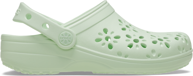 "The Classic Clog with a fresh, feminine twist! This new evolution of our clog features floral-inspired cutouts that provide a joyful, fun look, plus matching floral rivets that unify the design. These still feature the fully-molded lightweight construction and iconic comfort of the original, and can still be personalized with Jibbitz™ charms. It’s the irreverent, go-to comfort shoe that you and your kids love — now with a fun, floral update! "