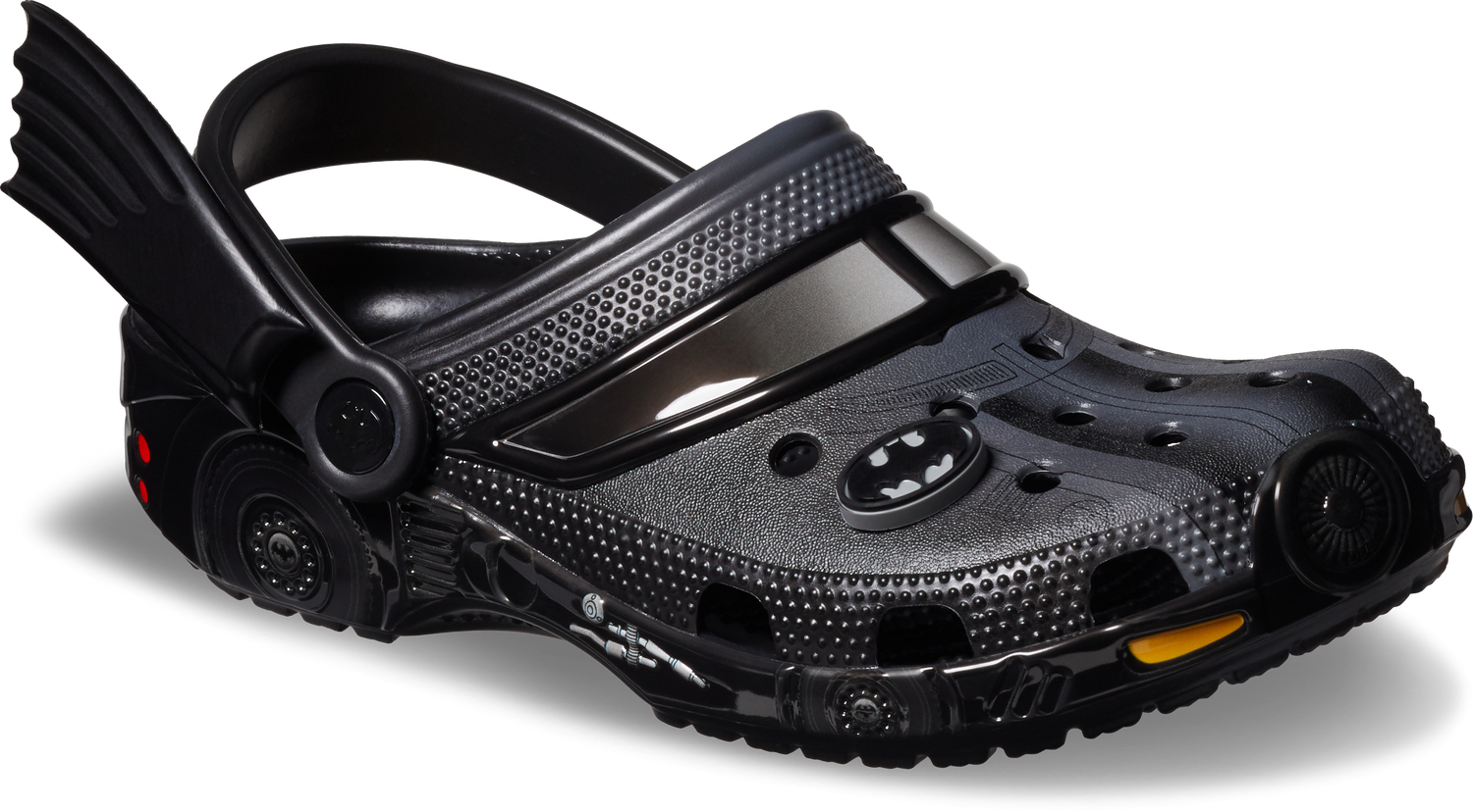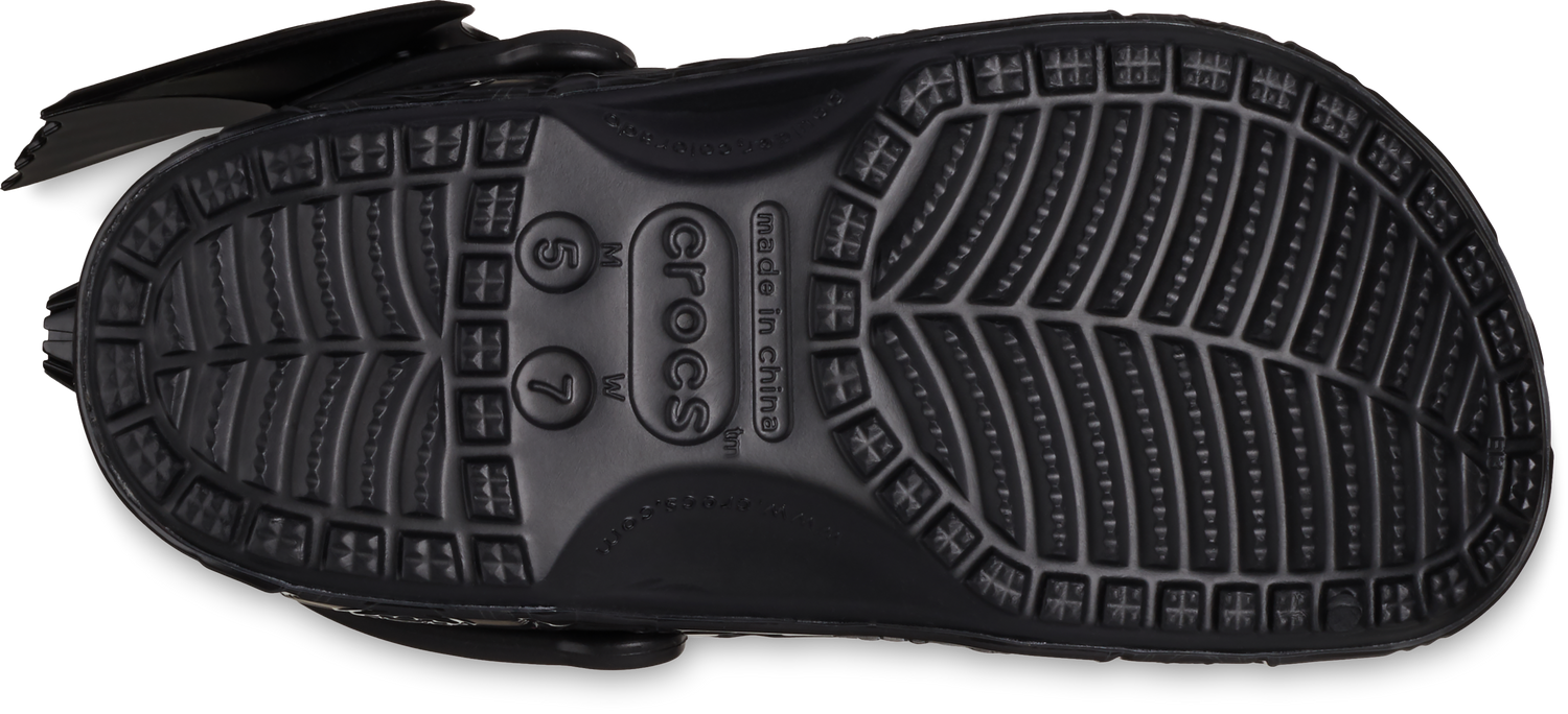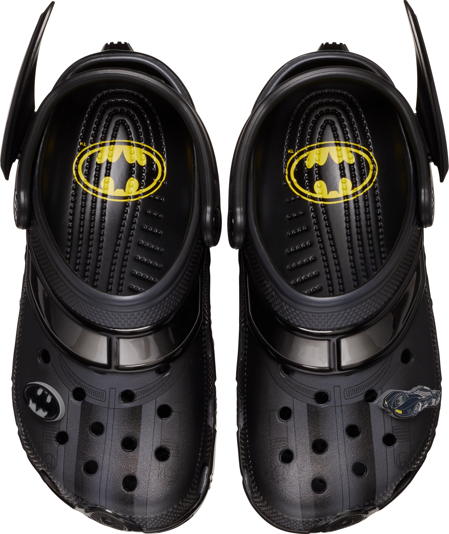 "Its high-octane style. The Batman Batmobile Classic Clog is ready to own the night (and the day) with a design inspired by Batman’s ride — right down to the bat wings on the side of the strap. And you can customize your new favorite mode of transportation, with Jibbitz™ charms. To the Batcave! Batman Batmobile Classic Clog Details: Incredibly light and fun to wear Water-friendly and buoyant; weighs only ounces Ventilation ports add breathability and help shed water and debris Exclusive Batmobile design Bat wing detail on heel strap Easy to clean and quick to dry Pivoting heel straps for a more secure fit Exclusive Batman Jibbitz™ charms Iconic Crocs Comfort™: Lightweight. Flexible. 360-degree comfort."