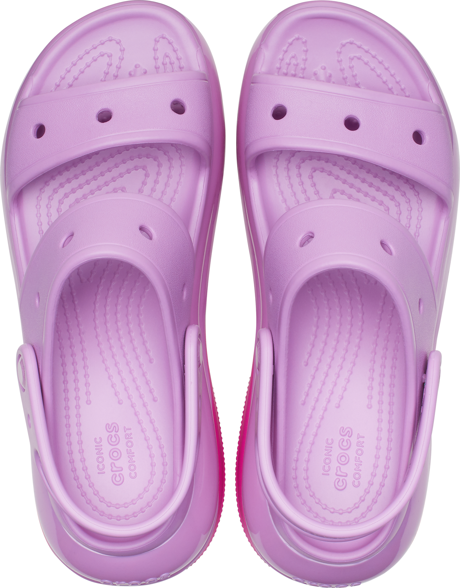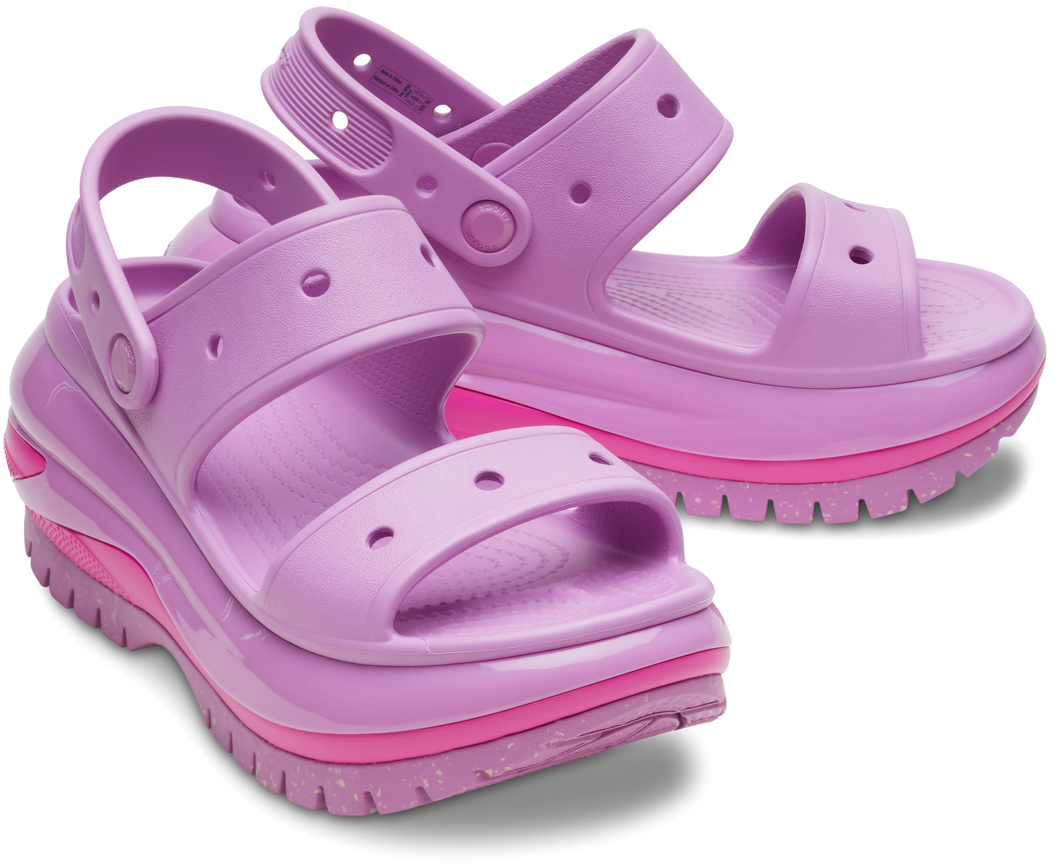 The look and feel of our Classic Mega Crush Clog is now available in sandal form. Introducing the Classic Mega Crush Sandal, featuring an enhanced rubber tread, updated detailing around the outsole and a platform ready to take any outfit to the next level. A two-strap upper and secure backstrap help ensure a secure fit, while boasting holes for personalization with Jibbitz™ charms. Are you ready for your new crush?