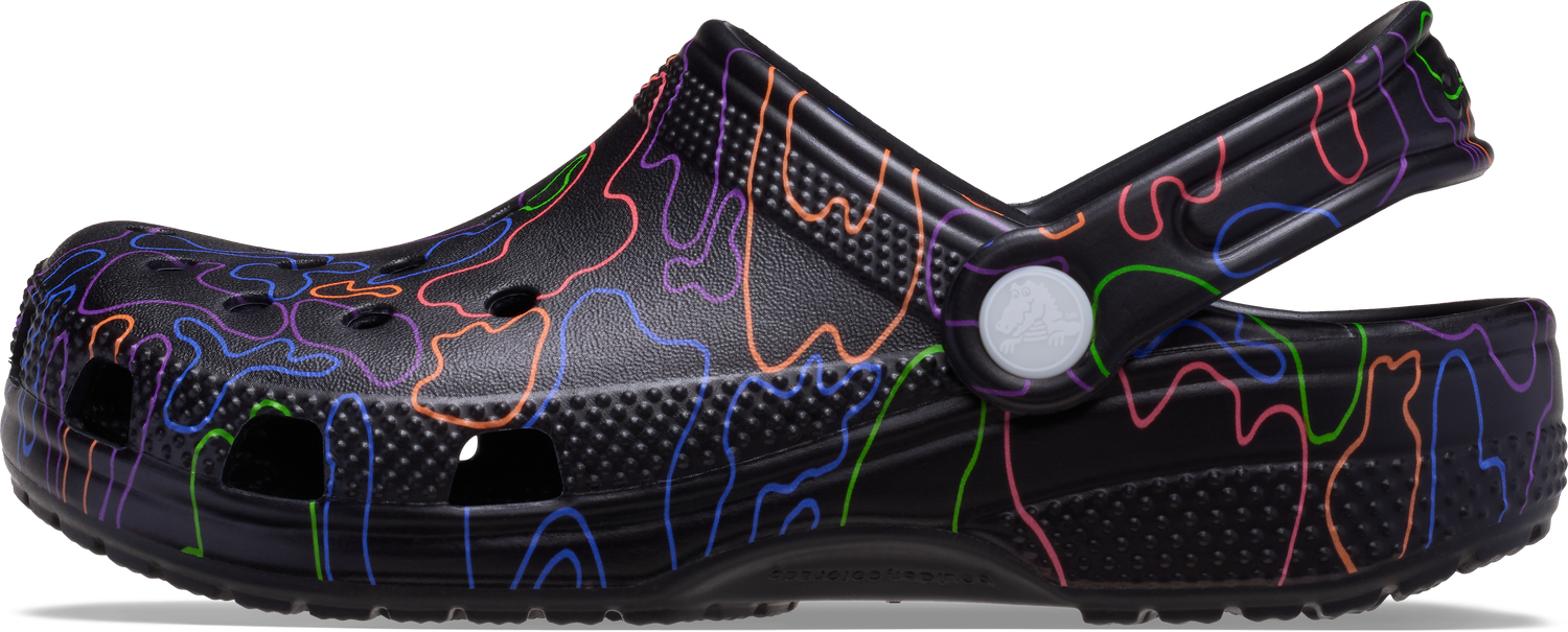 "A colorful camo graphic and unique glow-in-the-dark rivets provide extra style to this version of the iconic clog. The hi-vis graphic and glowing rivets make these shoes extra fun, while the Croslite™ foam construction keeps them light and easy to wear. Grounded in comfort, spiked with personality. "